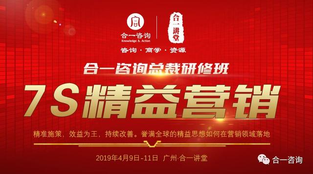 在此背景下,合一咨询将开启一场为企业经营策略层筹备的思想盛宴;推出一套“精准高效系统落地”的营销系统战法;现场将以“名师讲解、案例研讨、实战工具、嘉宾对话、专家点评”等形式,深度解密企业营销系统的构建与升级之道,引爆家居建材企业的营销革命。2019年4月9日-11日,合一咨询《7S精益营销》总裁研修班第三期与您相约广州!